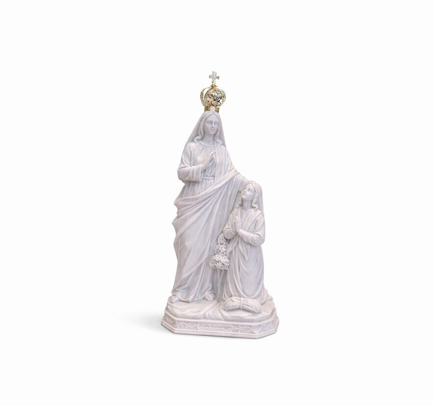 Produzida em pó de mármore de alta qualidade, a peça apresenta acabamento refinado e riqueza de detalhes que encantam à primeira vista. A coroa dourada acrescenta um toque de nobreza, destacando ainda mais a beleza e a importância simbólica da imagem.