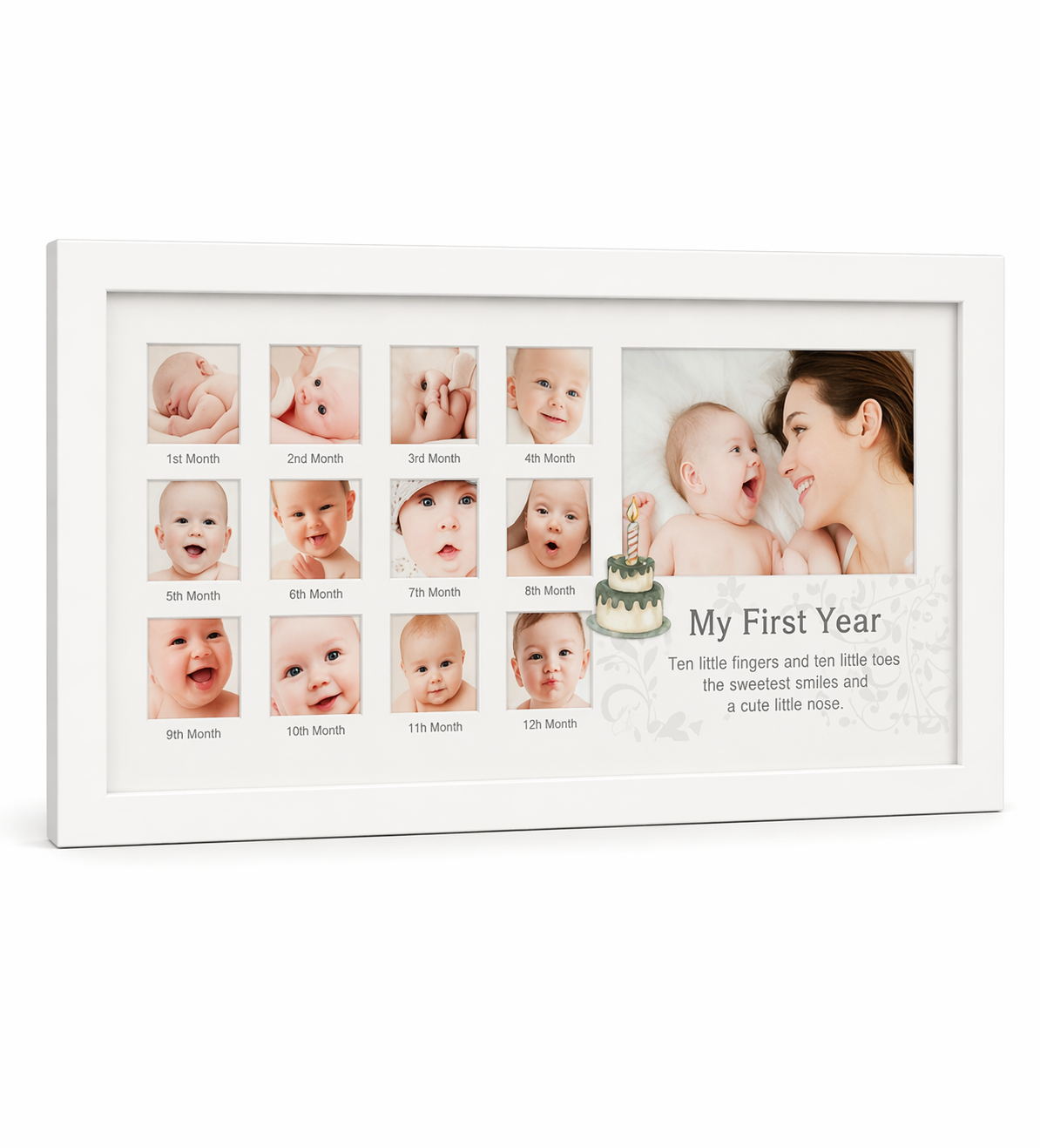 Com 12 delicados espaços para fotos mensais e um espaço lateral maior para a família completa, esta peça transforma o crescimento do bebê em uma narrativa visual repleta de amor e emoção.