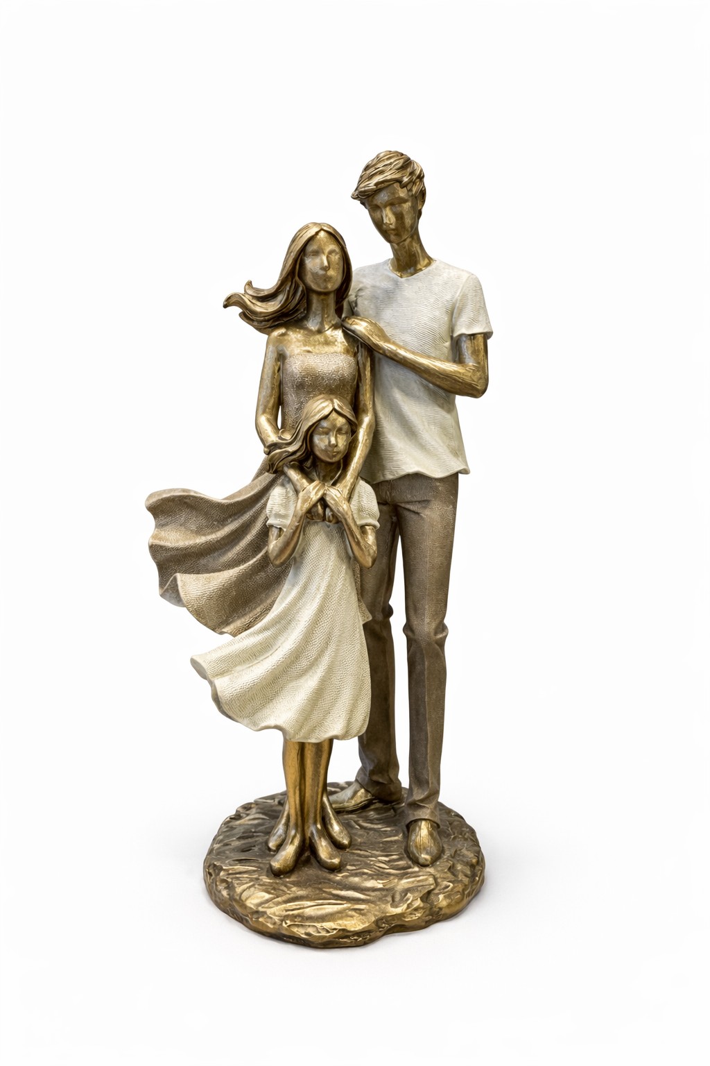 Estatueta em resina representando um casal com uma menina, capturando um momento de ternura e união familiar.