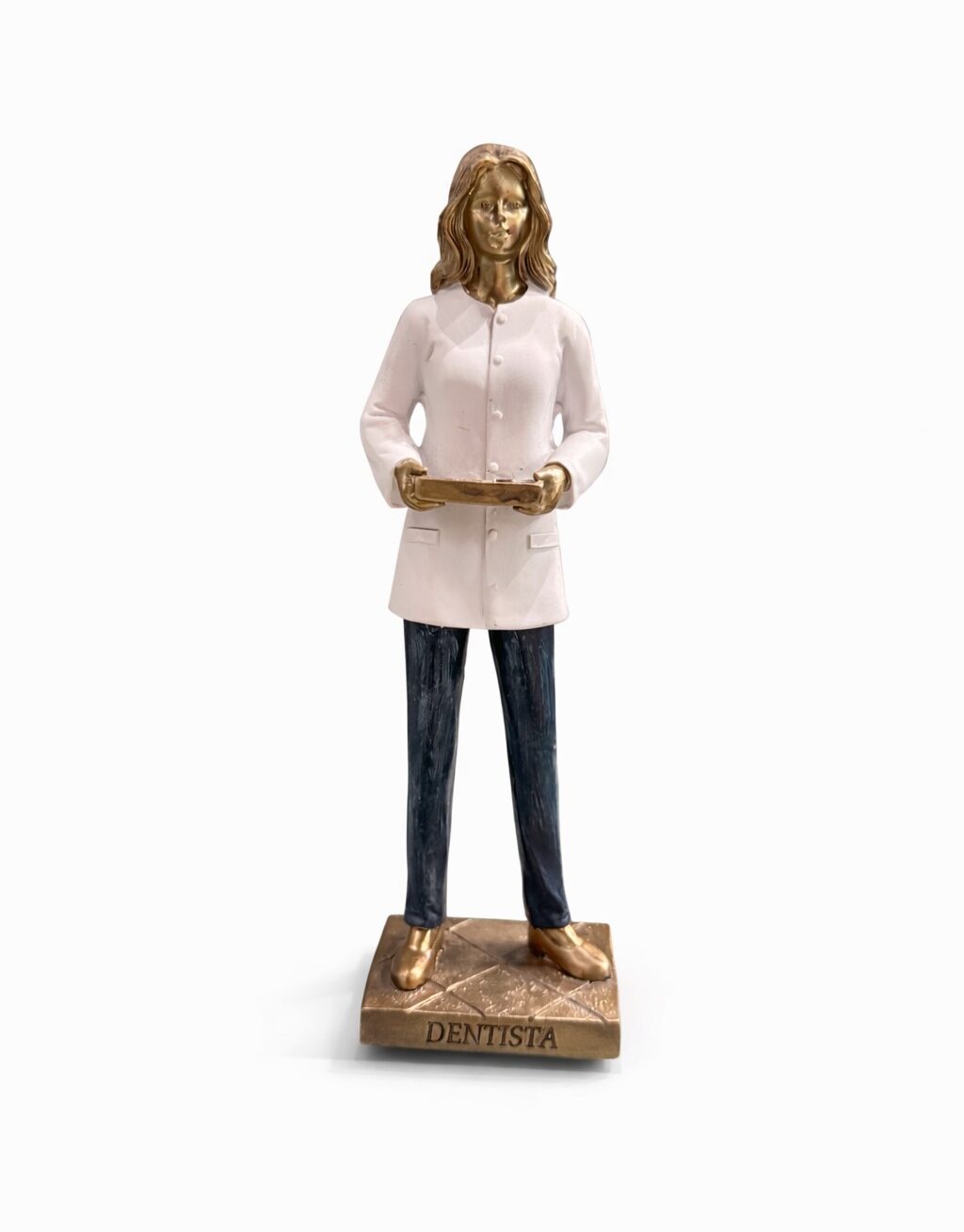 Uma estatueta delicadamente confeccionada em resina, representando uma dentista mulher, celebrando a elegância, habilidade e dedicação na área da odontologia.