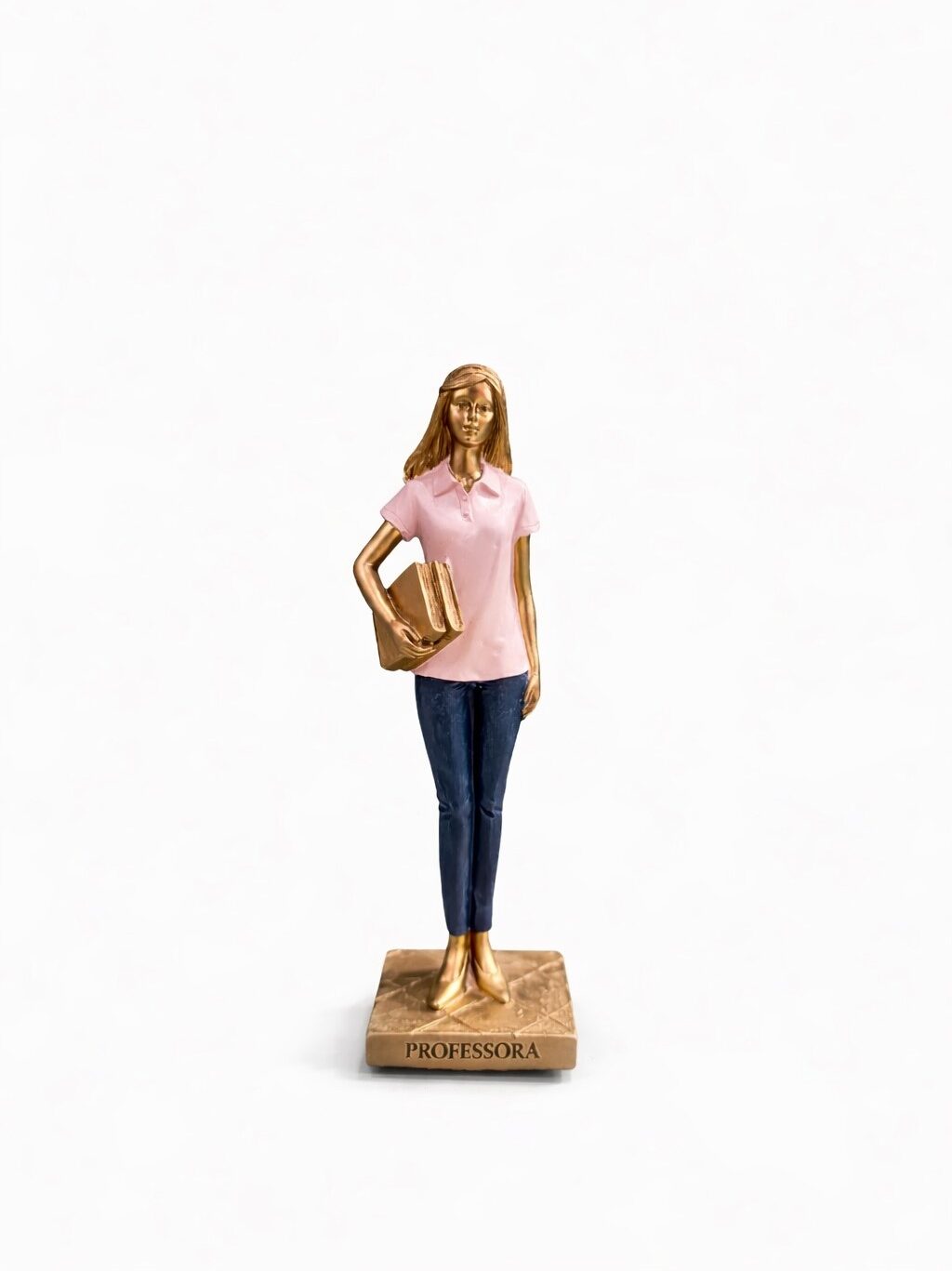 Uma estatueta em resina delicadamente esculpida, representando uma professora distinta, homenageando sua dedicação, sabedoria e o impacto duradouro na arte da educação.