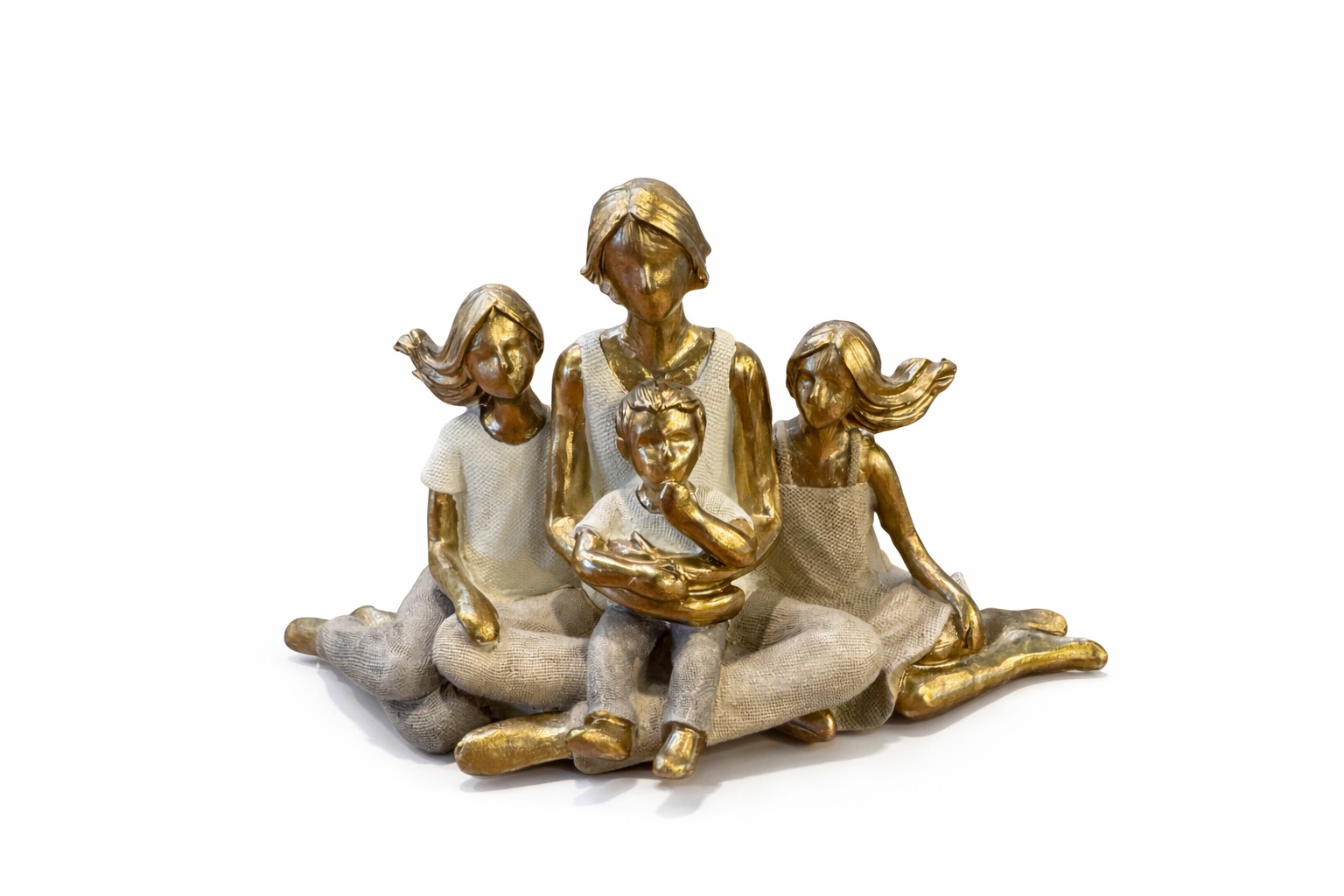 Estatueta em resina de mãe com dois meninas e um menino sentados, transmitindo carinho e união familiar.