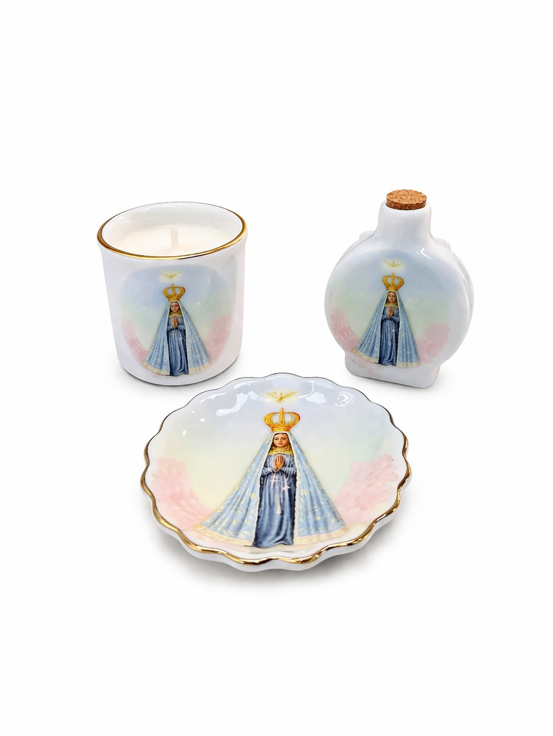 Todas as peças são decoradas com a imagem de Nossa Senhora, em tons suaves e acabamento delicado, transmitindo serenidade e devoção. Um conjunto especial para uso pessoal, presentear ou compor um cantinho de oração cheio de significado.