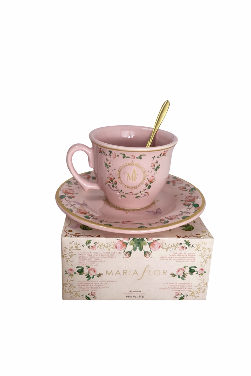1 xícara com pires de cerâmica MARIA FLOR, cuidadosamente desenhada para unir delicadeza e estilo à experiência do chá.
