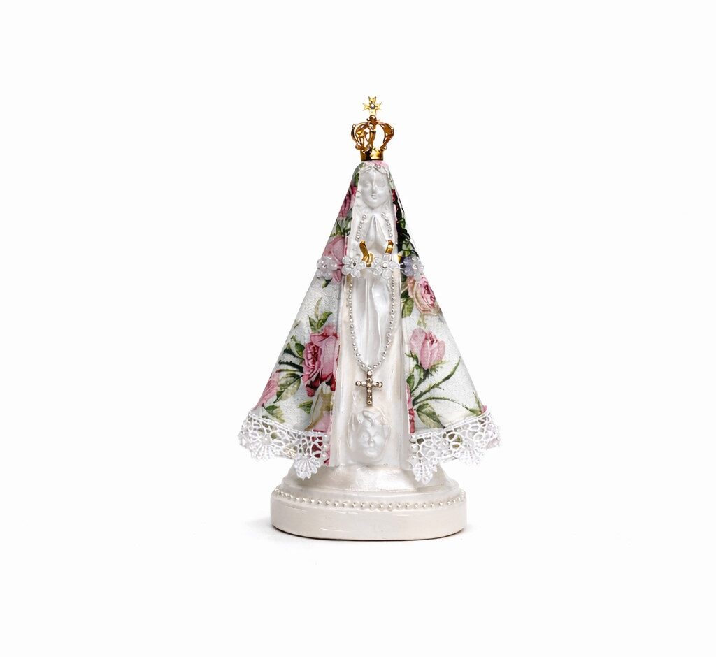 Imagem de Nossa Senhora Aparecida confeccionada em gesso, com delicado acabamento floral e coroa dourada detalhada. Uma peça elegante que une devoção e sofisticação, ideal para altar, decoração ou presente especial.