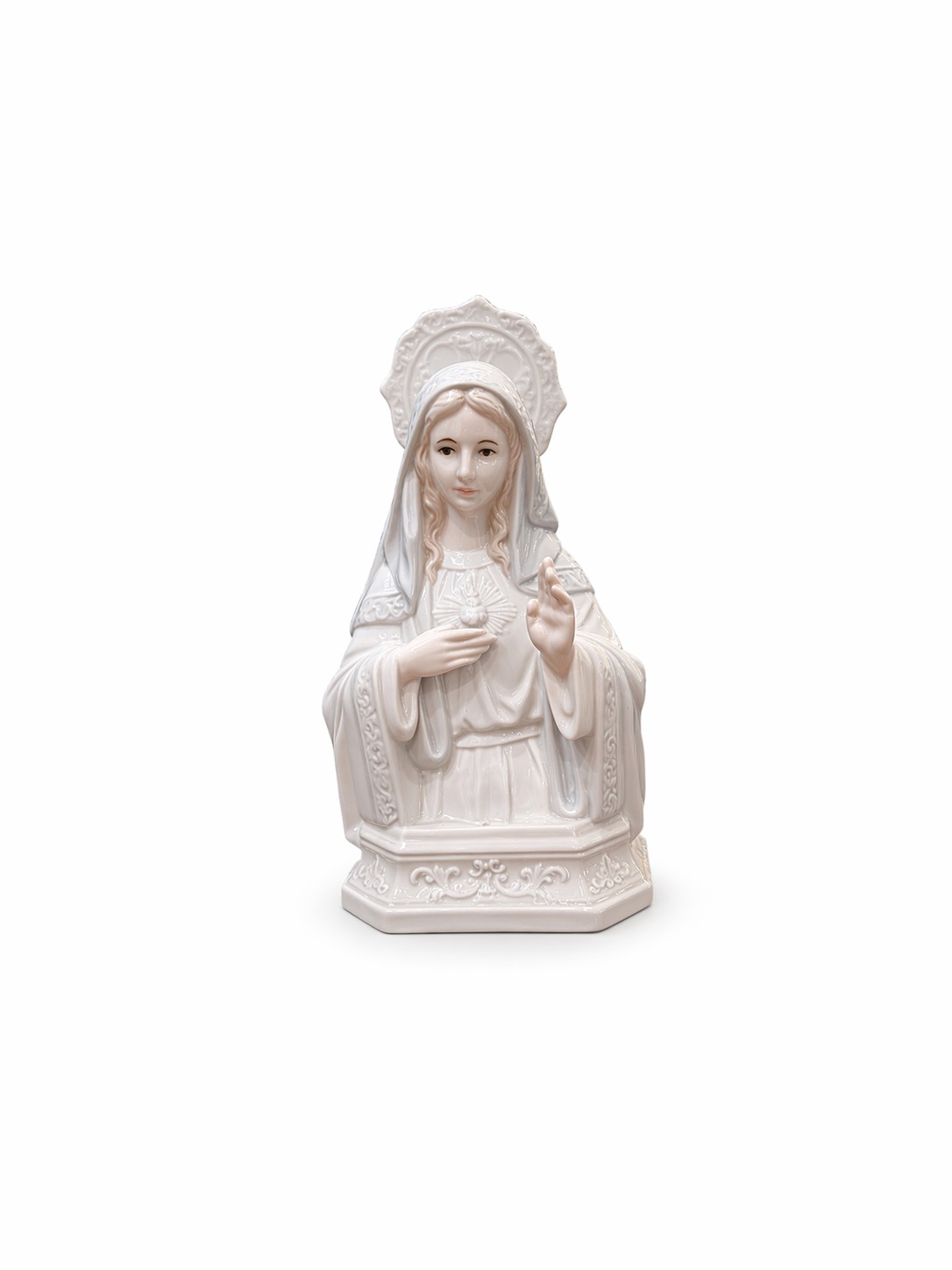 Uma peça que une devoção, delicadeza e sofisticação. Esta imagem do Sagrado Coração de Maria, confeccionada em porcelana de alta qualidade, apresenta uma tonalidade leve que transmite serenidade e paz ao ambiente.