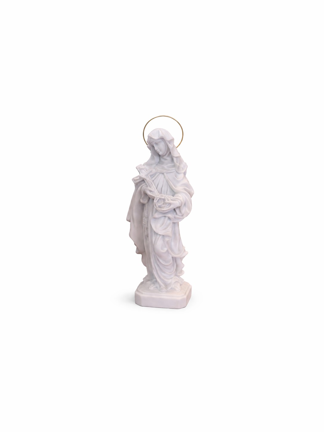 Produzida em pó de mármore de alta qualidade, esta imagem apresenta acabamento refinado e riqueza de detalhes que valorizam ainda mais sua presença. Sua estética delicada harmoniza perfeitamente com ambientes de oração ou decoração, trazendo um toque de paz e espiritualidade ao espaço.